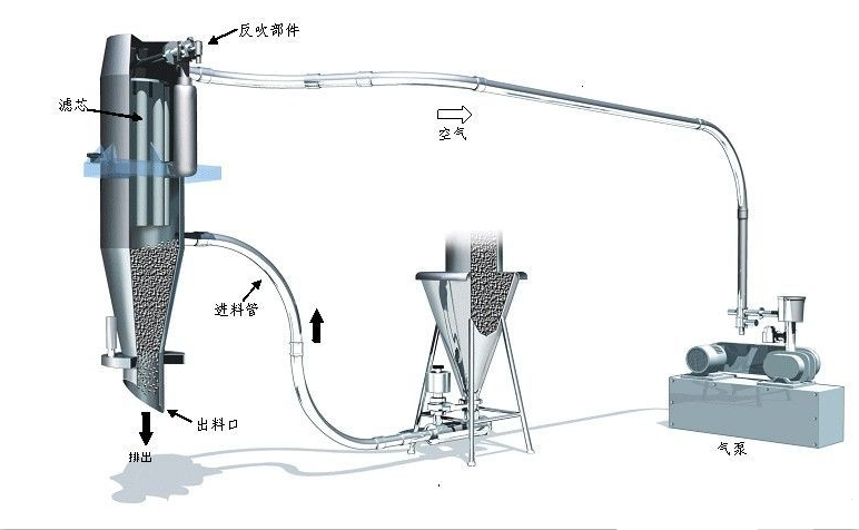下圖從左往右一次是真空上料機(jī),待輸送物料,真空氣源真空上料機(jī)是粉體輸送系統(tǒng)的真空輸送裝置,借助于真空發(fā)生源產(chǎn)生高真空形成的負(fù)壓氣流,輸送顆粒和粉末狀物料的設(shè)備。
